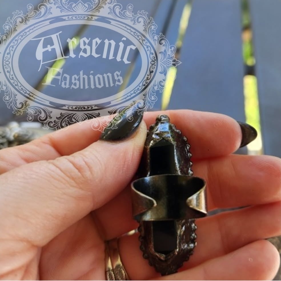The crystal measures 2" long and 7/8" wide Copper adjustable band will comfortably fit a US size 6-9
